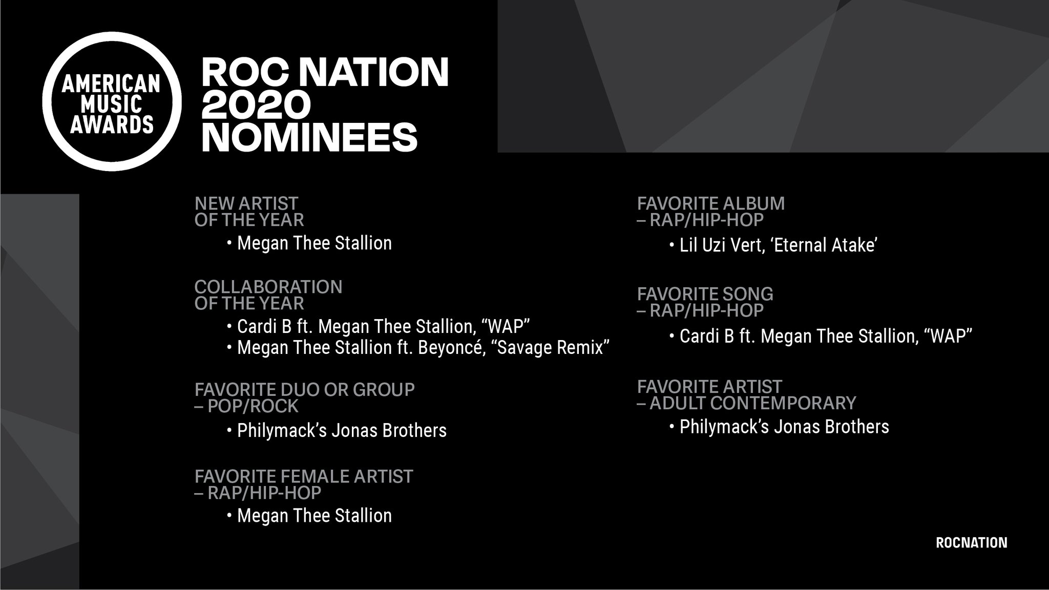 Roc Nation On Twitter Congrats To Roc Nation Artists Theestallion Liluzivert Amp Philymack S Jonasbrothers On Their 2020 Amas Nominations Https T Co Clempdhqse Https T Co L4bg1bg3kz Twitter